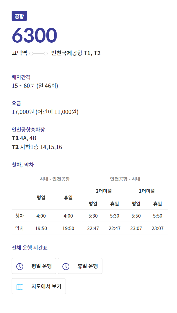 배차간격이 30회 이내로 운행을 하기 때문에 배차시간이 생각보다는 널널한것 같은데요. 아래 표를 보시고 승차장에 6300 버스가 오는 시간을 확인해 주세요. 제가 경험한바로는 시간은 거의 정확하더라구요.