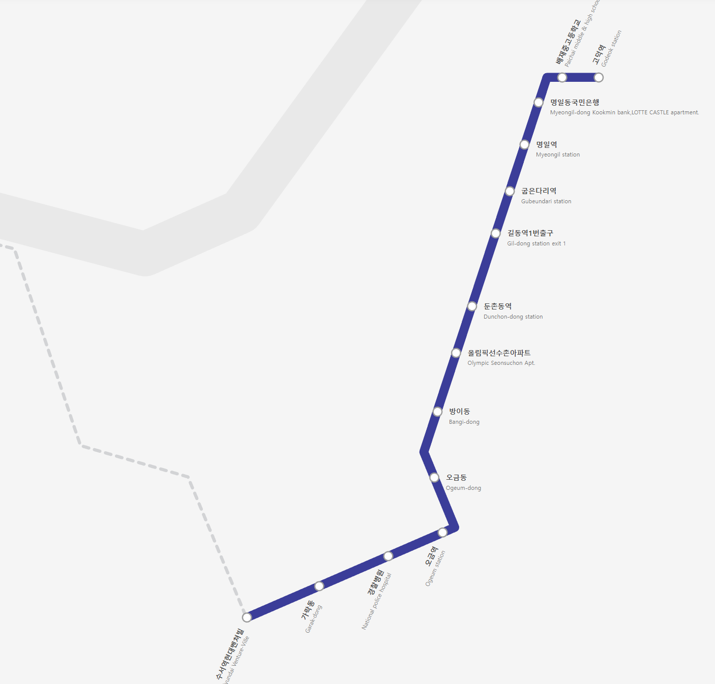 버스 이동경로입니다. 고덕역, 배재중고등학교, 명일동국민은행, 명일역, 굽은다리역, 길동역1번출구, 돈촌동역, 올림픽선수촌아파트, 방이동, 오금동, 오금역, 경찰병원, 가락동, 수서역현대벤처빌을 통과하는 노선입니다.