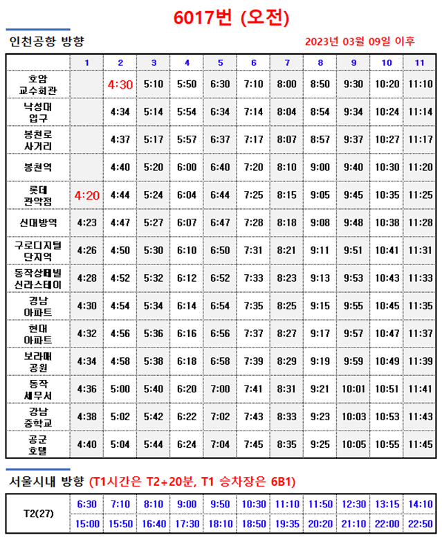 호음교수회관,낙성대입구,봉천로사거리,봉천역,롯데관악점,신대방역,구로디지털단지역,동작상떼빌신라스테이,경남아파트,현대아파트,보라매공원,동작세무서,강남중학교,공군호텔을 지나가는 노선입니다. 6017 공항버스는 4시 30분에 호암 교수회관에서 출발하는데요. 롯데관악에서 4시 20분에 출발하는게 첫차로 첫정류소 호암은 4시 30분에 출발합니다.