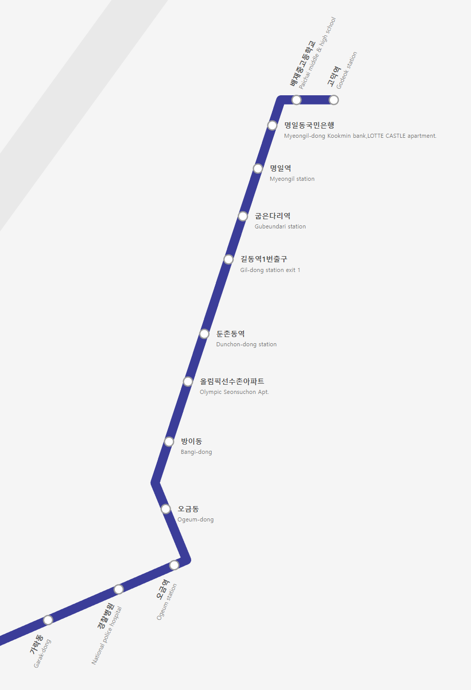 가락동에서 경찰병원, 오금역, 오금동, 방이동, 올림픽선수촌아파트, 둔촌동역, 길동역1번출구,굽은다리역,명일역,명일동국민은행,배재중고등학교,고덕역을 지나는 노선이며, 제일 첫 배차지는 수서역 벤치빌입니다.