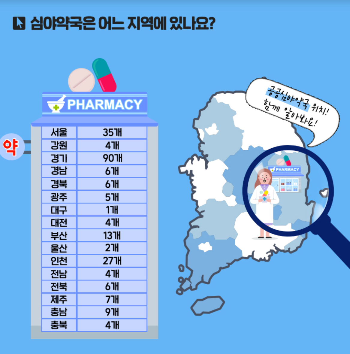 심야약국은 서울에 35개소, 강원 4개, 경기 90개, 경남 6개 등으로 분포되어 있습니다. 생각보다는 그렇게 많은 건 아닌것같네요. 자세히 보시면 경기에서 90개소가 있는걸 확인할 수 있는데요. 역시나 경기도가 인프라가 많아서인지 압도적이네요. 새벽시간에 급하게 좌약을 구하러 다닌 기억이 있는데 야밤에 하는 약국이 있으면 정말 좋겠더라구요.