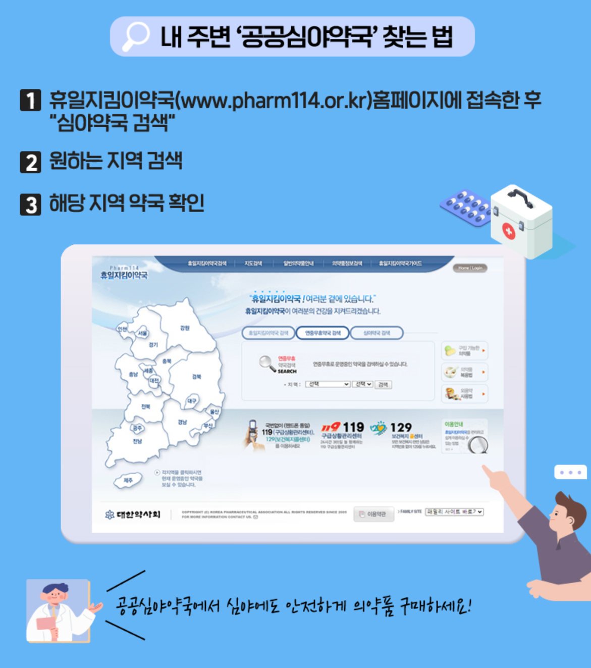 휴일지킴이 약국은 대한약사회에서 운영하는홈페이지로 휴일지킴이 약국, 연중무휴약국, 심야약국을 검색하실 수 있습니다. 간단한 의약품 안내도 같이 하고 있으니 자세한 정보가 필요하시면 접속해서 알아봐주시기 바라겠습니다.