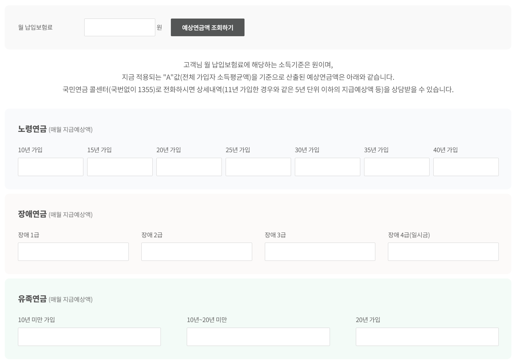 국민연금 예상 수령액을 조회하기 위해서는 월납입료를 기입을 해주셔야 합니다. 그에 따른 노령연금, 장애연금, 유족연금등을 조회해 보실 수 있게 구성이 되어 있습니다.