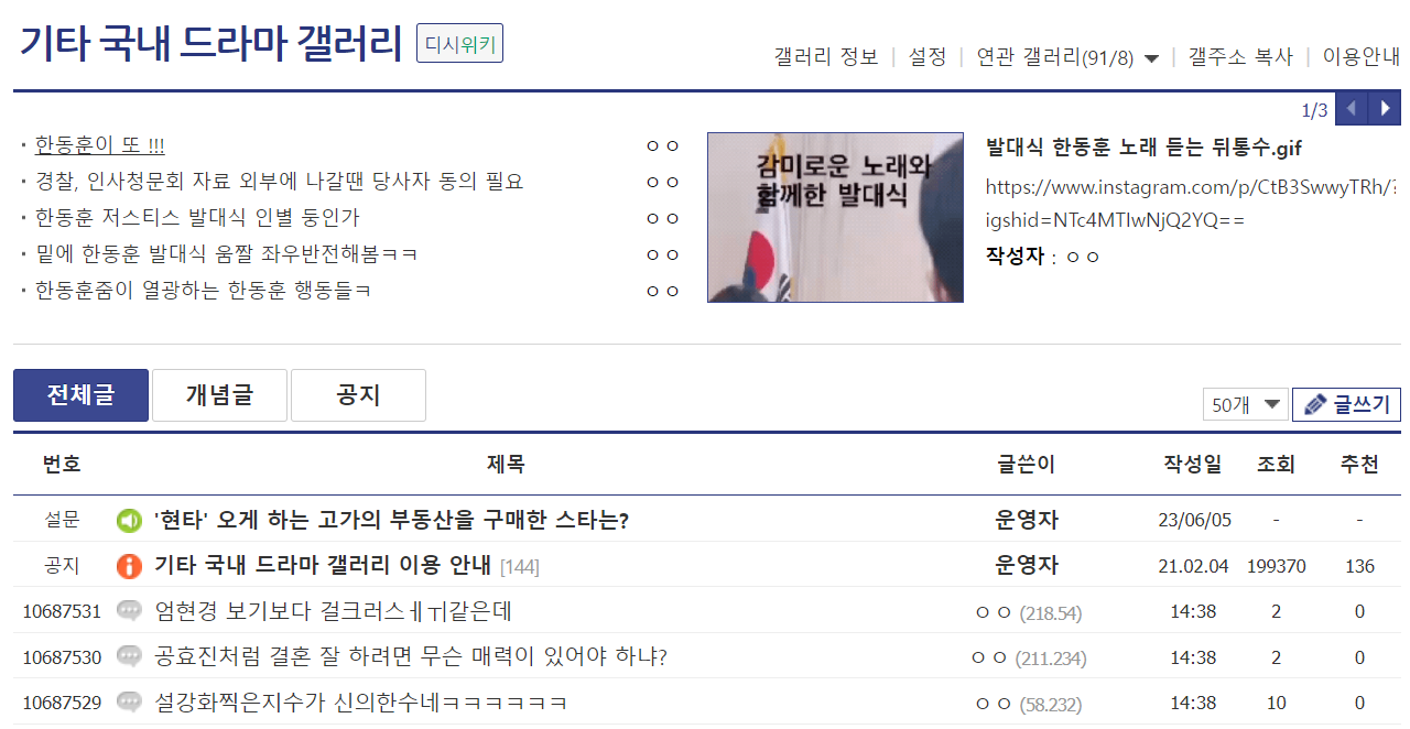 하지만 나름 유저가 많은 갤러리로서 예능과 연예인 이야기가 주를 이루고 있습니다.